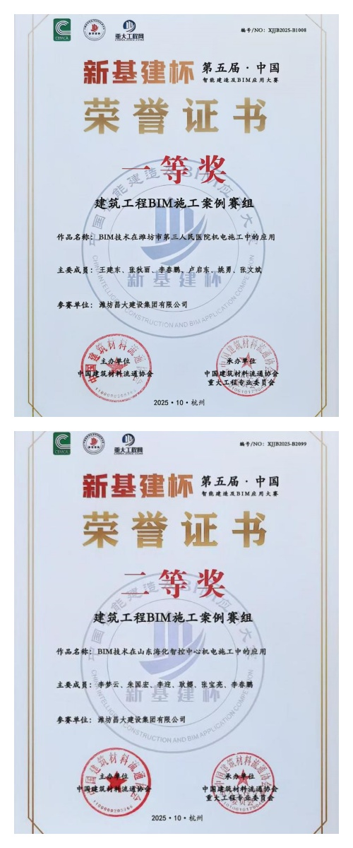 據(jù)悉,本屆大賽采取企業(yè)自愿參賽機(jī)制,經(jīng)過(guò)嚴(yán)格的形式審核、在線評(píng)審、視頻答辯及結(jié)果公示等環(huán)節(jié),最終確定獲獎(jiǎng)成果。其中,由集團(tuán)第二安裝公司申報(bào)的《BIM技術(shù)在濰坊市第三人民醫(yī)院機(jī)電施工中的應(yīng)用》和《BIM技術(shù)在山東海化智控中心機(jī)電施工中的應(yīng)用》分別榮獲一等獎(jiǎng)和二等獎(jiǎng)。